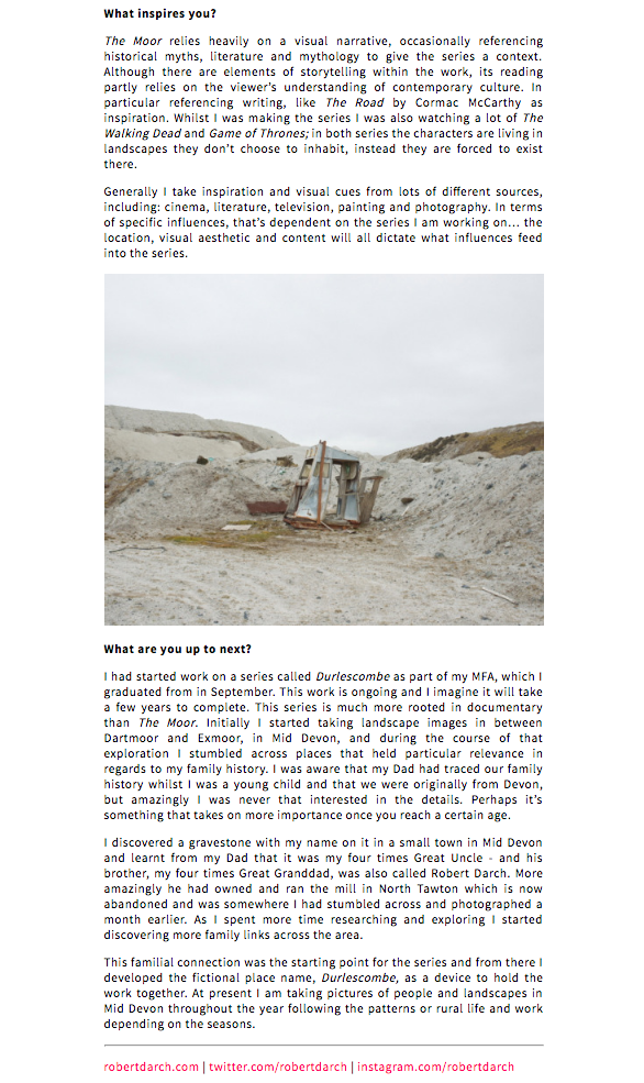 Website ‘Of The Land And Us’ featured my series The Moor’ and it’s founder and editor Ameena Rojee asked me some questions about the series and my work.